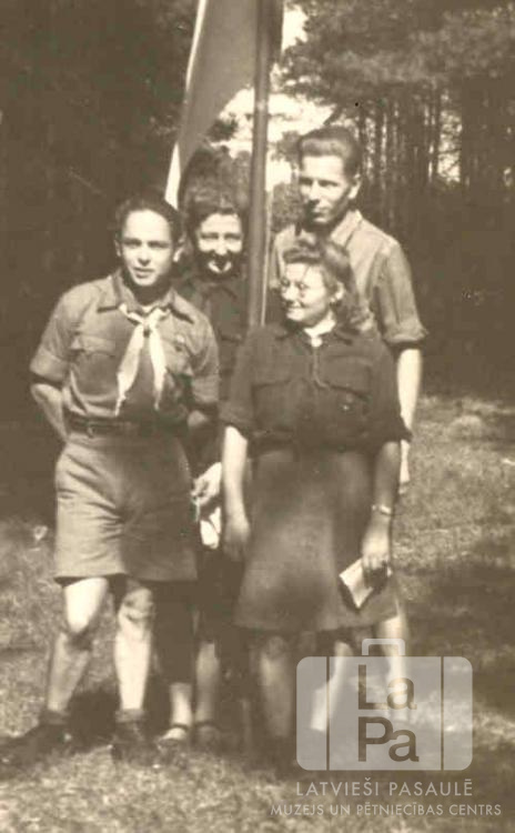 Četri skauti un gaidas formastērpos stāv pie Latvijas karoga Ventas nometnē Esernē (angļu zonā). Priekšā, no kreisās: skautu vadītājs Artūrs Stendze un lielgaida Elza Tauriņa (pr. Stendze). Aizmugurē, no kreisās: lielgaida Valija Ruģele un vadītājs Harijs Jansons.