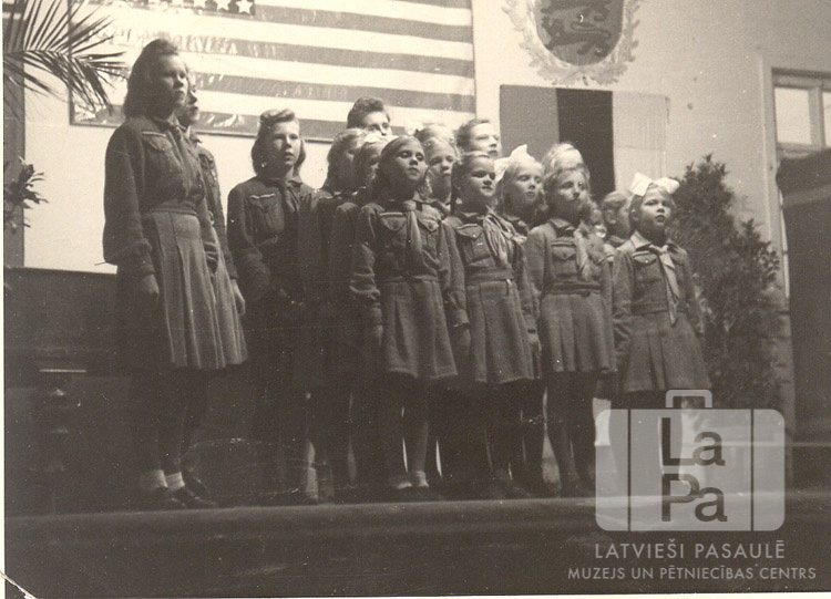 Gaidu un guntiņu grupas uzstājas Rotenburgas nometnē (amerikāņu zonā). Fonā pie sienas piestiprināts ASV karogs.