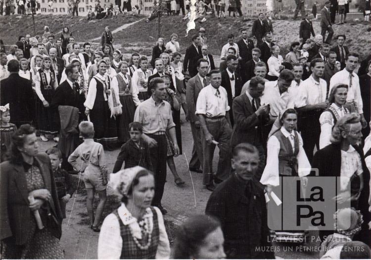 Liels cilvēku pūlis gājienā pa Eslingenes nometni (amerikāņu zonā). Daudziem gājējiem ir uzvalks, tautastērps vai kāds cits svinīgs tērps. Fonā redzams zemes uzbērums, aiz tā vairākas ēkas.