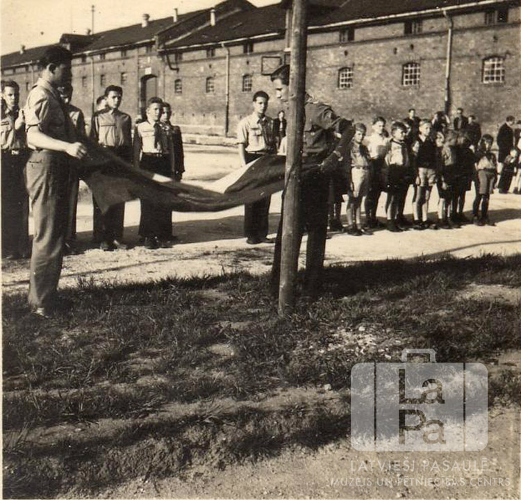 Divi skauti formastērpos ar Latvijas karogu rokās stāv pie masta laukumā Ansbahas nometnē (amerikāņu zonā). Aiz viņiem ierindā stāv zēni un jaunekļi skautu formastērpos. Fonā gara ķieģeļu ēka. Par šo gadījumu Ērika Ābele (dz. Ruduss) atceras: "Iksvētdienas Latvijas karoga uzvilkšana."