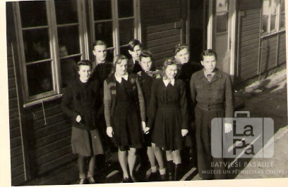 Četras meitenes un četri puiši no vidusskolas 1. klases stāv pie vidusskolas koka barakas logiem Mirvikas nometnē Flensburgā (angļu zonā) 1946.–1947. gadā. No kreisās: Ērika Šteins (pr. Vītoliņš), Aina Kreišmanis, Rasma Silders, Vizma Apsītis, Gunārs Salzirnis. Otrajā rindā, no kreisās: Teodors Grīnfelds, Tālivaldis Gruzna un Maigonis Barbāns.