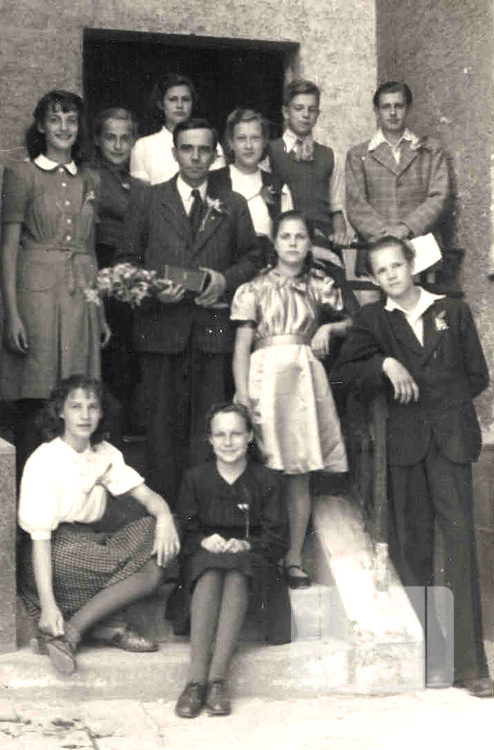 Jauniešu grupa svinīgos tērpos stāv uz kāpnēm pie ēkas ieejas Ingolštatē (amerikāņu zonā). Vienam vīrietim rokās ir ziedi.