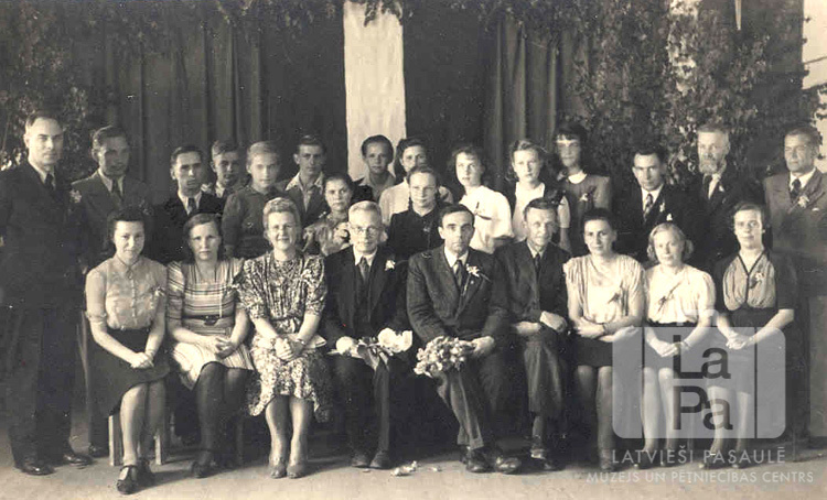 Formāls grupas portrets, divās rindās, priekšu rindā sēž uz krēsliem, vidējiem trim cilvēkiem puķu pušķi rokās, fonā ir pušķota skatuve un liels Latvijas karogs.