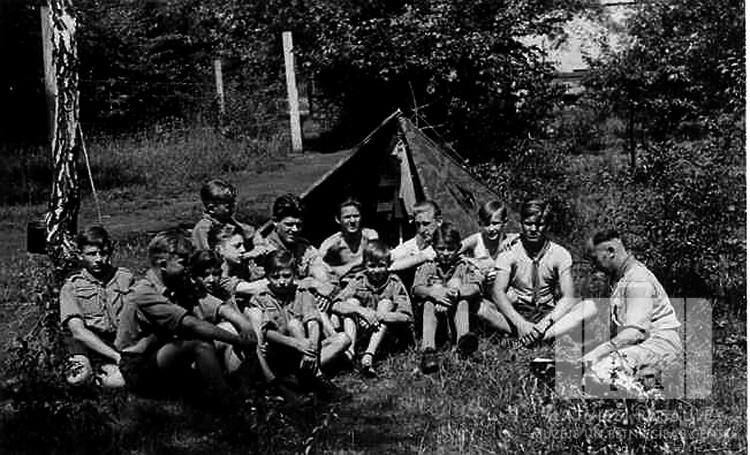 Embūtes skautu vienības zēni formastērpos sēž zālē telts priekšā mežā pie Ingolštates (amerikāņu zonā). Priekšplānā, labajā pusē, sēž vadītājs (?).