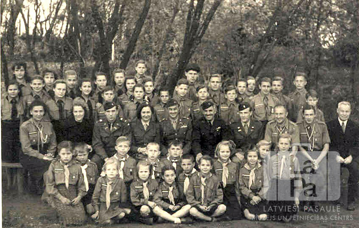 Embūtes skautu vienība ar vadītājiem Ingolštatē (amerikāņu zonā). Otrajā rindā uz krēsliem sēž skautu un gaidu vadītāji. Fonā koku rinda.