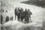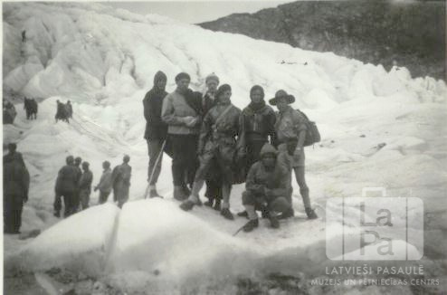 Vīriešu grupa stāv uz ledus gabala Norvēģijā, kurā bija arī Ervīns Miezītis no Ingolštates nometnes (amerikāņu zonā). Aiz grupas liels ledājs.