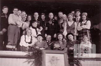 Grupa cilvēku uz skatuves tautas tērpos un skautu uniformās. Skatuves priekšpusē ir izpušķots, ierāmēts Beidena-Pouela portrets.