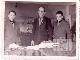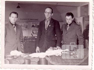 Trīs vīri uzvalkos stāv latviešu daiļamatniecības izstādē Neištatē (Holšteinā, angļu zonā). Priekšā galds ar adītām zeķēm un austu segu. Aizmugurē uz sienas ir Latvijas kartes un citi plakāti. No kreisās: otrais Alfreds ?, trešais Fēlikss Tālivaldis Ersts.