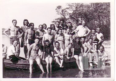 Liela jauniešu grupa uz airu laivas ezeru krastā pie Neištates (Holšteinā, angļu zonā). Labajā pusē redzami: Gunārs Grava, ? Petrovs (baltā kreklā) un Fēlikss Tālivaldis Ersts (pieliecies).