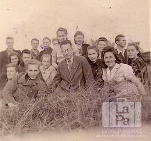 Latviešu skolas audzēkņu un skolotāju grupa zālē Neištatē (Holšteinā, angļu zonā) 1945. gada vasarā. Attēlā redzamas: Dzintra ?, Olga ?, Valentīne ?.