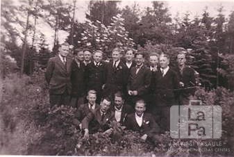 Latviešu Lauksaimniecības skolas traktoristu klases vīri uzvalkos mežā pie Alterfrādes (angļu zonā) 1946. gada vasarā. Priekšā, otrais no kreisās: Fēlikss Tālivaldis Ersts. Aizmugurē, piektais no kreisās puses: Gunārs Grava.