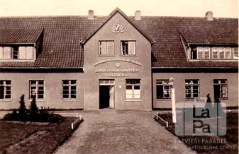 Vienstāvu ēka ar mansardu, skats pa taku kura ved uz priekšu durvīm, virs durvīm ģērbonis un uzraksts.