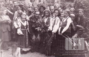 Cilvēku grupa Jāņu svinībās Eitinē (angļu zonā). Meitenēm tautastērpi un ziedu vainagi, vidū sēž vīrietis ar lapu vainagu ap kakla, labajā pusē puisis sēž uz riteņa.
