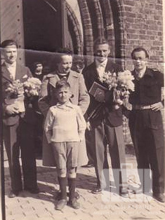 Gravu ģimene un Fēlikss Tālivaldis Ersts pēc iesvētībām stāv pie lielām vācu baznīcas ieejas durvīm Neištatē (Holšteinā, angļu zonā). Diviem vīriešiem puķu pušķi rokās. Priekšā: Jānis Grava. Aizmugurē, no kreisās: Edvīns Grava, ? Grava, Jānis Grava, Gunārs Grava, Fēlikss Tālivaldis Ersts.
