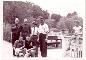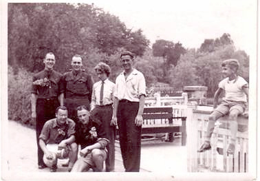 Cilvēku grupa uz takas pie Kellersee ezera, blakus Eitīnei (angļu zonā). Kreisajā pusē redzams koka žogs un aizmugurē koka sols. Fonā koki un krūmi. Priekšā, pirmais no kreisās: Fēlikss Tālivaldis Ersts. Kreisajā pusē, uz žoga: Jānis Grava.