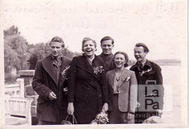 Pieci jaunieši, organizācijas "United Nations Relief and Rehabilitation Administration" (UNRRA) latviešu atpūtas mājas darbinieki, pie Kellersee ezera blakus Eitīnei (angļu zonā). Fonā koka margas, kreisajā pusē ar kokiem apaudzis ezera krasts. Piektais no kreisās: Fēlikss Tālivaldis Ersts.