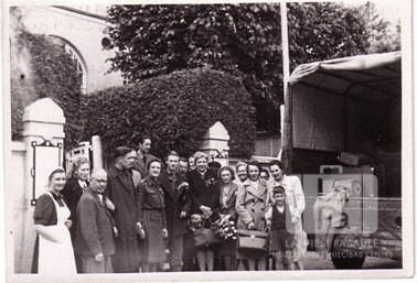 Cilvēku grupa pie organizācijas "United Nations Relief and Rehabilitation Administration" (UNRRA) latviešu atpūtas mājas Kellersee ezera krastā, blakus Eitīnei (angļu zonā). Labajā pusē smagā mašīna, kurā salikti čemodāni. Aiz grupas redzmi ieejas vārti, augsts dzīvžogs, kā arī mūra ēkas daļa.
