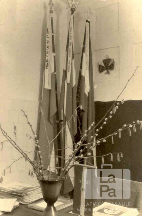 Imulas 58. un Amulas 59. skautu vienību un Amulas 6. gaidu vienības karogi vienību mītnē Centrālajā nometnē Vircburgā (amerikāņu zonā). Trīs Latvijas karogi ir uzstādīti mastos telpas stūrī, bet priekšplānā, uz galda, ir mazāks Latvijas karogs, vāze ar pūpolu zariem, kā arī vairākas dokumentu kaudzes. Foto autors: Guntis Kuškēvics.