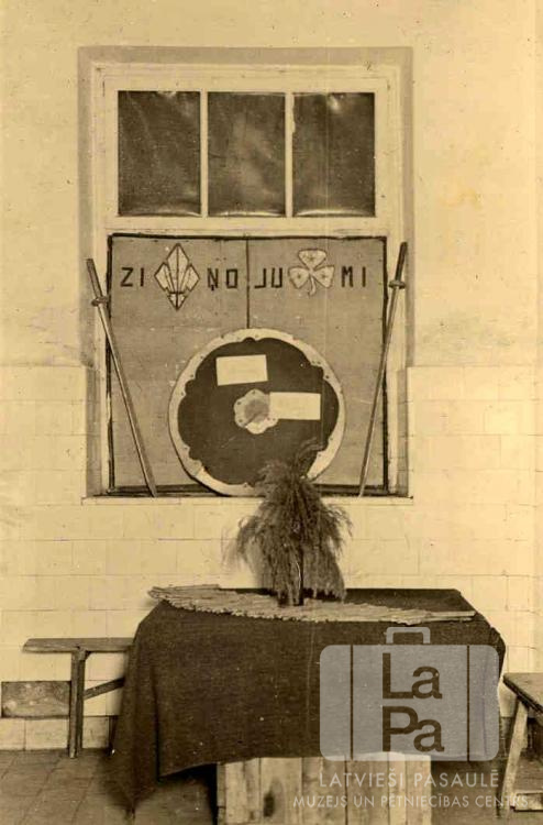 Ziņojumu dēlis Imulas 58. un Amulas 59. skautu vienību mītnē Centrālajā nometnē Vircburgā (amerikāņu zonā). Loga apakšējā daļa ir aizklāta ar papīra/dēļa (?) gabaliem; uz tā uzraksts "ZIŅOJUMI". Uz loga apmales pret ziņojumu dēli atspiests vairogs ar zobenu katrā malā. Priekšplānā ar audumu pārklāts koka dēļu galds ar puķu vāzi uz tā. Aiz galda vienkāršs sols. Foto autors: Guntis Kuškēvics.