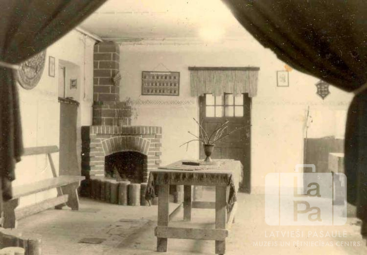 Izdekorētas istabas iekārtojums Imulas 58. un Amulas 59. skautu vienību mītnē, Centrālajā nometnē, Vircburgā (amerikāņu zonā). Kreisajā stūrī ķieģeļu kamīns ar uz zemes sakrautiem koka klučiem. Kreisajā malā sols, telpas vidū ar audumu pārklāts koka galds, uz tā vāze ar koku zariem. Pie telpas galējās sienas durvis. Priekšplānā uz abām pusēm atvilkti aizkari. Foto autors: Guntis Kuškēvics.