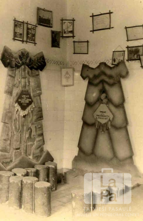 Izdekorēts telpas stūris Centrālajā nometnē Vircburgā (amerikāņu zonā). Priekšplānā uz grīdas rindā sakārtoti koka kluči, aiz tiem dekoratīvas Imulas 58. un Amulas 59. skautu vienību mazskautu pulciņu Staburaga klintis ar uzrakstiem. Virs tām ierāmēti attēli un dokumenti. Foto autors: Guntis Kuškēvics.