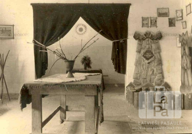 Izdekorētas istabas iekārtojums Imulas 58. un Amulas 59. skautu vienību mītnē, Centrālajā nometnē, Vircburgā (amerikāņu zonā). Priekšplānā, telpas vidū, ar audumu pārklāts koka galds, uz tā vāze ar koku zariem. Telpas aizmugurē izeja ar uz abām pusēm atvilktiem aizkariem. Labajā stūrī uz grīdas sakārtoti koka kluži, pie sienām divas mākslinieciskas kompozīcijas, virs tām ierāmēti attēli un dokumenti. Foto autors: Guntis Kuškēvics.