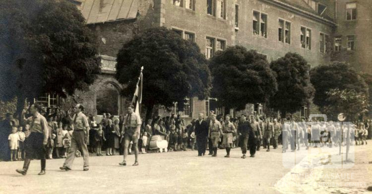 Skauti formastērpos soļo Centrālās nometnes laukumā Vircburgā (amerikāņu zonā). Trešais gājējs nes Latvijas karogu. Aiz viņiem, otrā ielas pusē zem koku rindas, ir sastājušies skatītāji. Aiz skatītājiem nometnes vairākstāvu ēka. Gājiena priekšgalā soļo, no kreisās: Aleksandrs Osis (Abavas novada un Imulas 58. skautu vienības priekšnieks, vadītājs), Fricis Sīpols (Imulas 58. roveru dzimtas priekšnieks vadītājs), Guntis Kuškēvics (karognesējs).