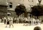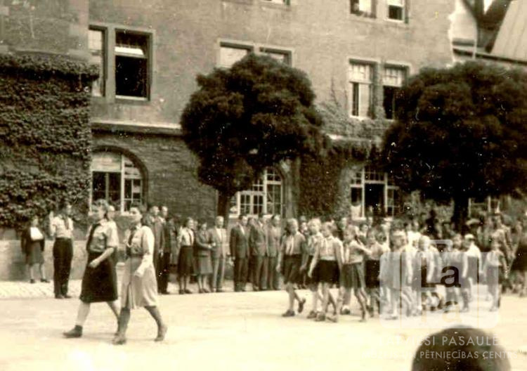Gaidas formastērpos soļo trīs Vircburgas nometņu gaidu vienību parādē gar vairākstāvu ēku Centrālajā nometnē Vircburgā (amerikāņu zonā). Aiz gājiena dalībniecēm pie ēkas redzama skatītāju rinda.