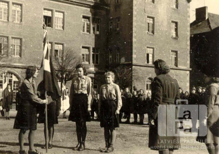 Vircburgas Rietumu nometnes gaidas formastērpos stāv Centrālās nometnes laukumā Vircburgā (amerikāņu zonā). Sieviete kreisajā pusē tur Latvijas karogu. Aizmugurē meitenes formastērpos stāv ierindā. Fonā vairākstāvu nometnes mūra ēka.