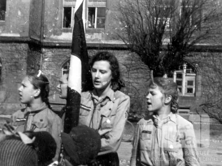 Četras Vircburgas Rietumu nometnes gaidas formastērpos ar Latvijas karogu stāv Centrālās nometnes laukumā Vircburgā (amerikāņu zonā). Fonā vairākstāvu nometnes mūra ēka.