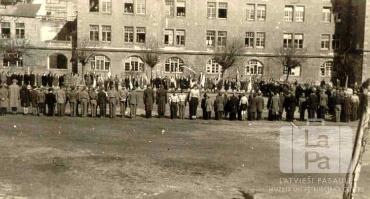 Cilvēki stāv divās paralēlās rindās Centrālās nometnes laukumā Vircburgā (amerikāņu zonā). Fonā nometnes vairākstāvu mūra ēka. Par šo gadījumu Fricis Sīpols atceras: "Atzīmējot latviešu gaidu 25 gadu jubilejas svinības, visas amerikāņu zonas gaidu vienības ar saviem vienību karogiem pulcējās Vircburgā."