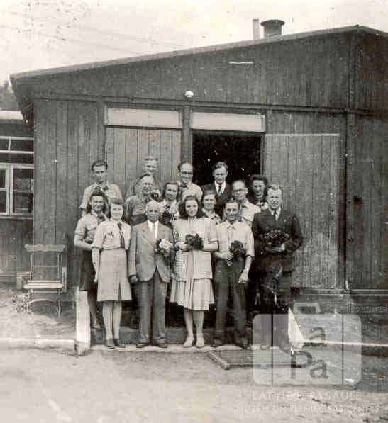 Rietumu nometnes Vircburgā (amerikāņu zonā) vadība un gaidu un skautu vadītāji stāv pie nometnes administrācijas barakas. Cilvēki ir ģērbušies uzvalkos, kleitās un skautu un gaidu formastērpos.