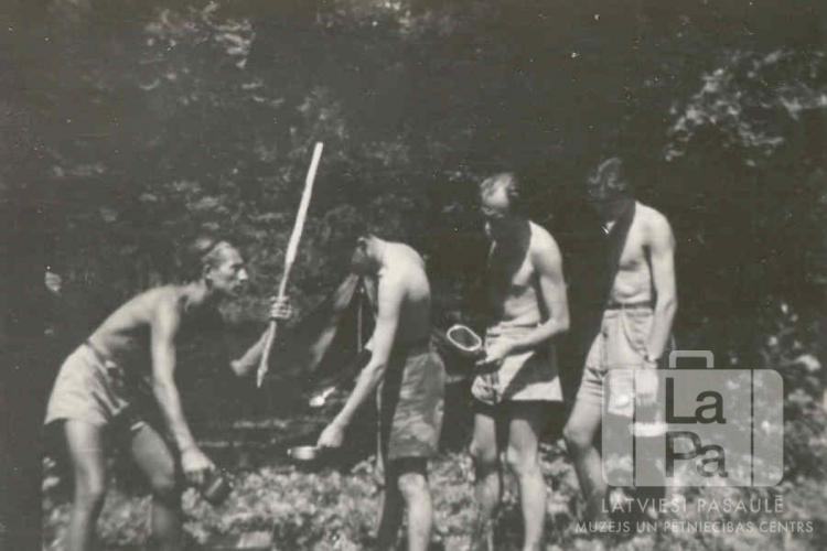 Četri Imulas 58. roveru vienības vīrieši no Centrālās nometnes Vircburgā (amerikāņu zonā) šortos stāv mežā ar ēdiena traukiem rokās 1947. gada vasarā, nedēļas nogales sirojuma laikā. Sirojumā bija ietverta arī pārnakšņošana mežā. Pirmais no kreisās: Harijs Tauriņš. Foto autors: Guntis Kuškēvics.