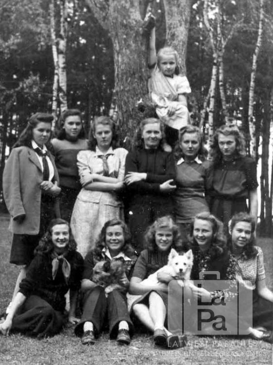 Amulas 6. gaidu vienības lielgaidas no Centrālās nometnes Vircburgā (amerikāņu zonā) savā nometnē mežā 1948. gada vasarā. Divas meitenes priekšējā rindā tur rokās suņus. Priekšā, no kreisās: Irēna Lizlova, Līga Zirnīte, Gaida Āboliņa, Raita Eglīte un Līze ?. Otrajā rindā, no kreisās: Velta Jaunzema, Anna Upesleja, Zigrīda ?, Laima Bite (vadītāja), Vija Mezīte un Rasma ?. Aizmugurē: ? Bite.