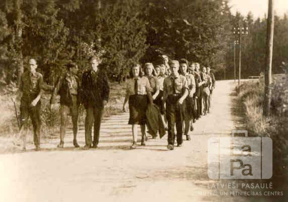 Roveri un lielgaidas no Centrālās nometnes Vircburgā (amerikāņu zonā) formastērpos soļo ierindā pa zemes ceļu. Kreisajā ceļa pusē egļu mežs, labajā ceļa pusē elektrības stabu rinda. Foto autors: Guntis Kuškēvics.