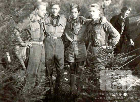 Četri skauti no Vircburgas (amerikāņu zonā) formastērpos stāv egļu mežā. Aizmugurē, labajā pusē, divi vīrieši dodas garām teltij. Foto autors: Guntis Kuškēvics. Par šo gadījumu Fricis Sīpols atceras: "Abavas novada roveri un lielgaidas no visām trim Vircburgas DP nometnēm satiekas savā sagaitā "Satekla" Baireitas apkārtnē, Bavārijā."