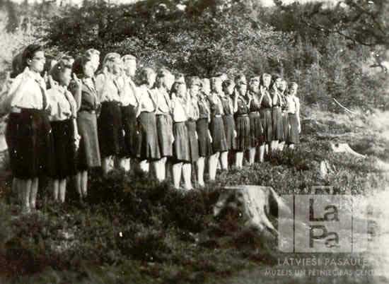 Gaidas no Vircburgas (amerikāņu zonā) formastērpos stāv ierindā meža izcirtumā. Viņām priekšā uz zemes redzami celmi, aizmugurē mežs.
