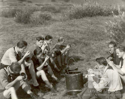 Imulas 58. skautu vienības roveru dzimta no Centrālās nometnes Vircburgā (amerikāņu zonā) formastērpos ēd pusdienas nometņošanas laikā Mainas upes krastā. Roveri zālē sēž divās rindās viena otrai pretī un ēd no metāla traukiem. Pa vidu starp rindām ir liels katls. Foto autors: Guntis Kuškēvics. Par šo gadījumu Fricis Sīpols atceras: "Dīpīšu laikos skautu nometņu mūžīgās pusdienas bijā lielā katlā vārīta zupa ar pāris šķēlēm rupjmaizes."