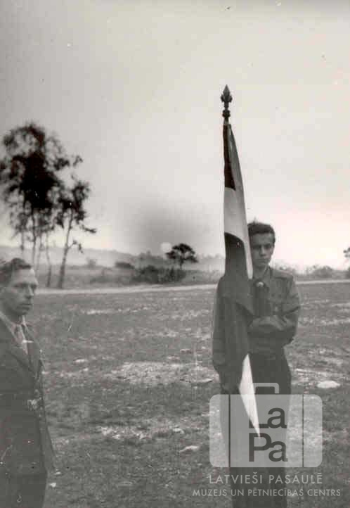 Divi Imulas 58. skautu vienības roveru dzimtas roveri no Centrālās nometnes Vircburgā (amerikāņu zonā) stāv uz lauka savas dzimtas pārdomu naktī un saullēkta svinīgajā roveru solījumā, ap 1947. gadu. Viens no viņiem tur Latvijas karogu. Aizmugurē, malā, neliels koku puduris; tālumā saules lēkts.