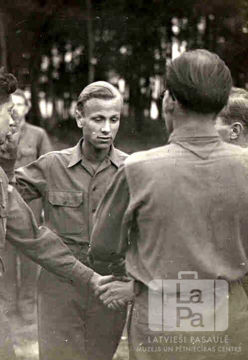 Fotogrāfijas dāvinātāja rakstītais atmiņu stāsts par bēgļu gaitām un bēgļu nometnēm: "Latviju atstāju 1944. gada septembra beigās no Liepājas ostas. Kaŗa beigas sagaidīju Vācijā, Bavārijas lauku ciematā. 1945. gada vasarā un rudenī strādāju pie amerikāņu armijas būvbataljona lidlauka atjaunošanas darbā. 1945. gada novembrī ieguvu DP statusu un sāku dzīvot Vircburgas Centrālajā DP nometnē. Vircburgā vēl bija divas citas DP nometnes – "Epp ielas”, ar apmēram 700 latviešiem, un "Ziemeļu nometne”, kuŗā dzīvoja visu trīs Baltijas valstu tautieši – latvieši apmēram 500. Centrālā nometnē dzīvoja ap 3500 latvieši. Šai nometnē dzīvodams, 1945. gada rudenī sāku darboties latviešu skautu kustībā un 1946. gada rudenī savā profesijā – nometnes tautskolā par skolotāju. 1947., 1948. un 1949. gada vasarās strādāju YMCA bērnu nometnēs. Pirmajā gadā par padomnieku, tad par programmas vadītāju un 1949. gadā par nometnes direktoru. 1949. gada augustā apprecējos ar Irēnu Lizlovu. 1949. g. septembrī sāku strādāt YMCA apgabala birojā par filmu izrāžu vadītāju. Šai darbā biju līdz izceļošanas dienai uz ASV 1950. gada jūnijā."