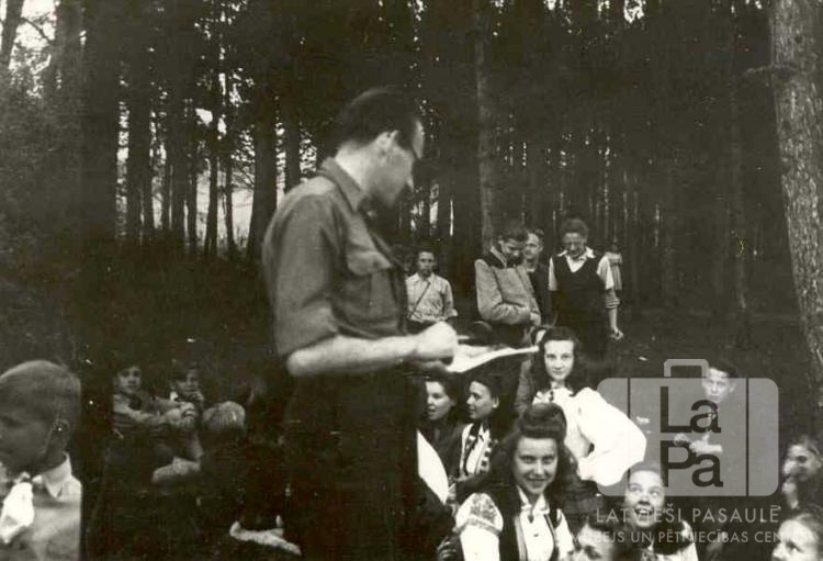 Stāv vīrietis skautu formā, apkārt sēž bērni un jaunieši.