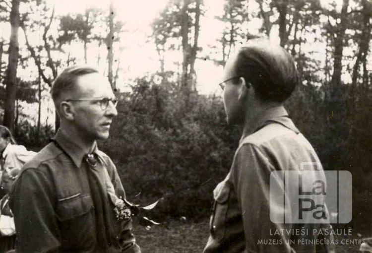 Divi skautu vadītāji no Vircburgas (amerikāņu zonā) skautu formastērpos sarunājas meža malā. No kreisās: Visvaldis Zīrāks (Rietumu jeb "Epp ielas" nometnes skautu vadītājs) un Fricis Sīpols (Centrālās nometnes skautu vadītājs).