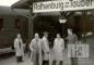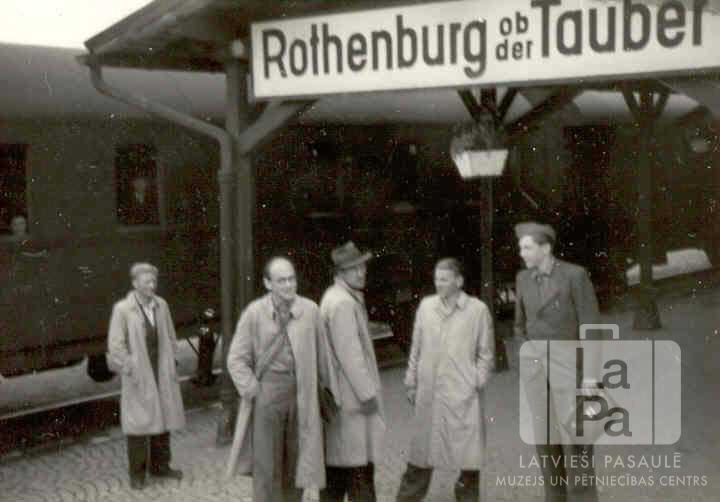 Pieci vīrieši no Imulas 58. skautu vienības Centrālajā nometnē Vircburgā (amerikāņu zonā) stāv vilciena stacijā blakus vagonam izbraukuma laikā uz vēsturisko pilsētu "Rothenburg ob der Tauber". Virs vīriešiem zīme ar uzrakstu: "Rothenburg ob der Tauber".