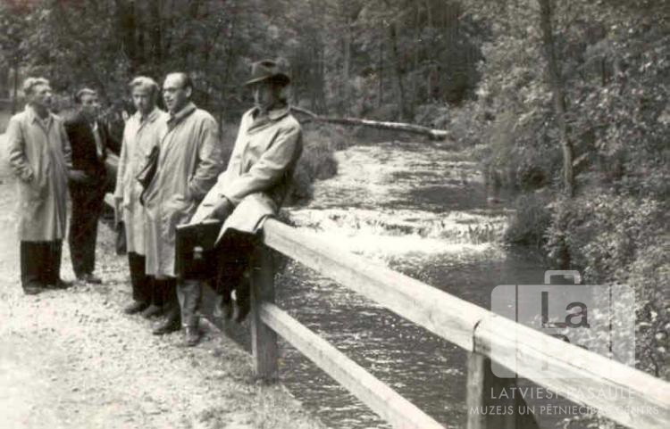 Pieci vīrieši no Imulas 58. skautu vienības Centrālajā nometnē Vircburgā (amerikāņu zonā) stāv uz tilta pāri upei izbraukuma laikā uz vēsturisko pilsētu "Rothenburg ob der Tauber". Abos upes krastos mežs. Četri no vīriešiem valkā garus, gaišus mēteļus; viens ir ģērbies tumšā apģērbā.