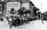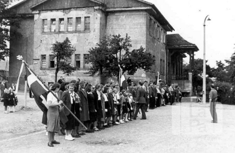 Skauti un gaidas stāv stāv ierindā Centrālās nometnes Vircburgā (amerikāņu zonā) rīkotos svētkos "Mēs augsim Latvijai". Vairākiem cilvēkiem rokās ir Latvijas karogi. Aizmugurē ir redzami skatītāji. Aiz ierindas ir redzama ēka, kur atradās skautu un gaidu mītnes un luterāņu dievnams.