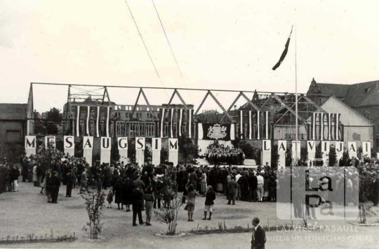 Cilvēku pūlis stāv Centrālās nometnes laukumā Vircburgā (amerikāņu zonā) nometnes rīkotos svētkos "Mēs augsim Latvijai". Svētkos piedalījās arī skauti un gaidas. Aiz pūļa, ēkas karkasa vidū uz paaugstinājuma, stāv cilvēku grupa, virs tās – Latvijas ģerbonis. Abpus paaugstinājuma uz ēkas sienām uzraksts "MĒS AUGSIM LATVIJAI". Virs uzraksta plīvo 16 Latvijas karogi. Viens karogs augstu mastā plīvo pūļa vidū. Par šo gadījumu Fricis Sīpols atceras: "Dekorācijas ir Latvijas Nacionālās operas direktora, mākslinieka Rožlapas veidotas."