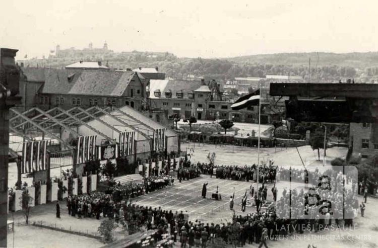 Cilvēku pūlis stāv Centrālās nometnes laukumā Vircburgā (amerikāņu zonā) nometnes rīkotos svētkos "Mēs augsim Latvijai". Svētkos piedalījās arī skauti un gaidas. Kreisajā pusē, uz ēkas karkasa sienas plīvo 16 Latvijas karogi, pa vidu tiem Latvijas ģerbonis. Viens Latvijas karogs augstu mastā plīvo laukuma vidū. Aiz laukuma ir redzamas pilsētas dzīvojamās ēkas; aiz tām mežs un Vircburgas pils siluets.