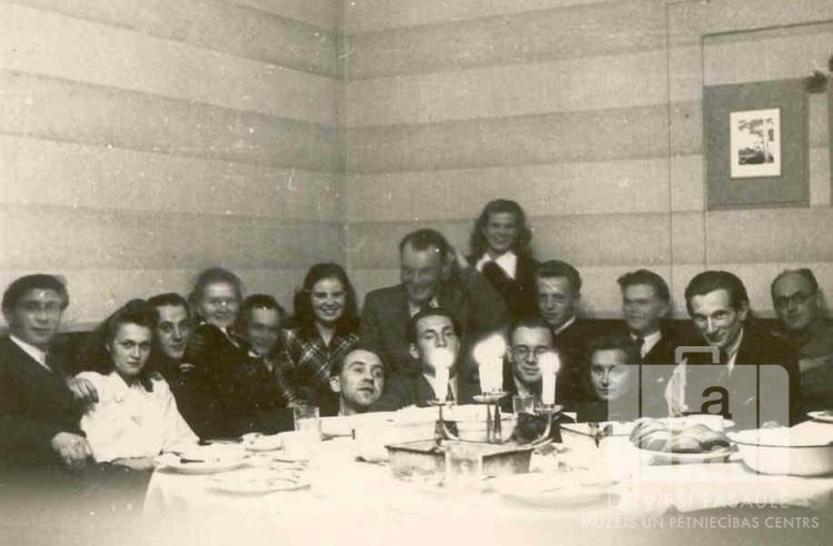Cilvēku grupa sēž aiz galda Centrālajā nometnē Vircburgā (amerikāņu zonā) saviesīgā roveru un lielgaidu vakarā. Uz galda trauki un svečturis ar svecām. Kreisajā pusē pie sienas zīmējums. No labās: pirmais vadītājs Fricis Sīpols, otrais Eižens Lizlovs.