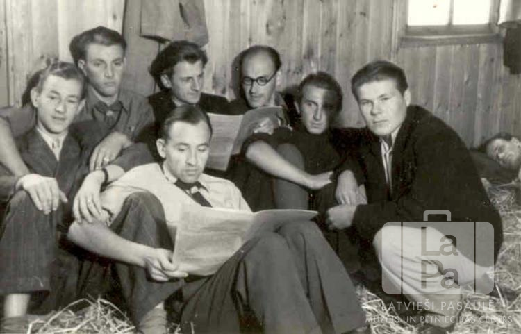 Grupa vīrieši barakā ar salmiem uz grīdas.