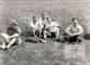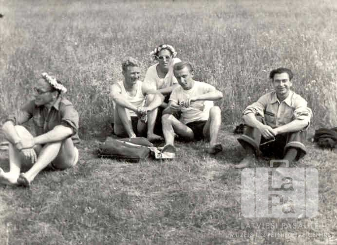 Pieci vīrieši no Centrālās nometnes Vircburgā (amerikāņu zonā) sēž pļavā roveru un lielgaidu Jāņu laika izpriecas izbraukumā. Diviem vīriešiem galvās puķu vainagi. Pirmais no kreisās: Fricis Sīpols. Foto autors: Guntis Kuškēvics.